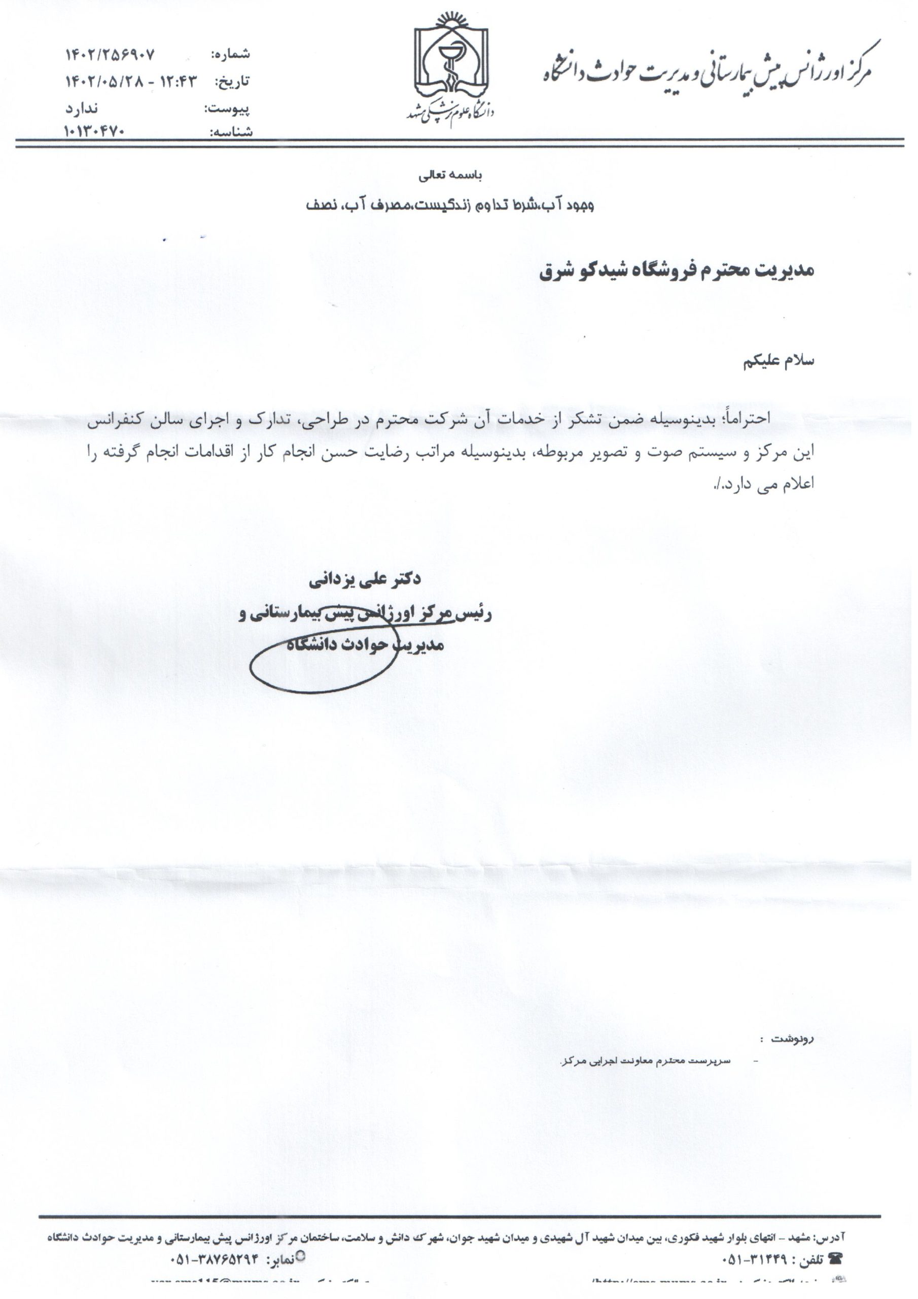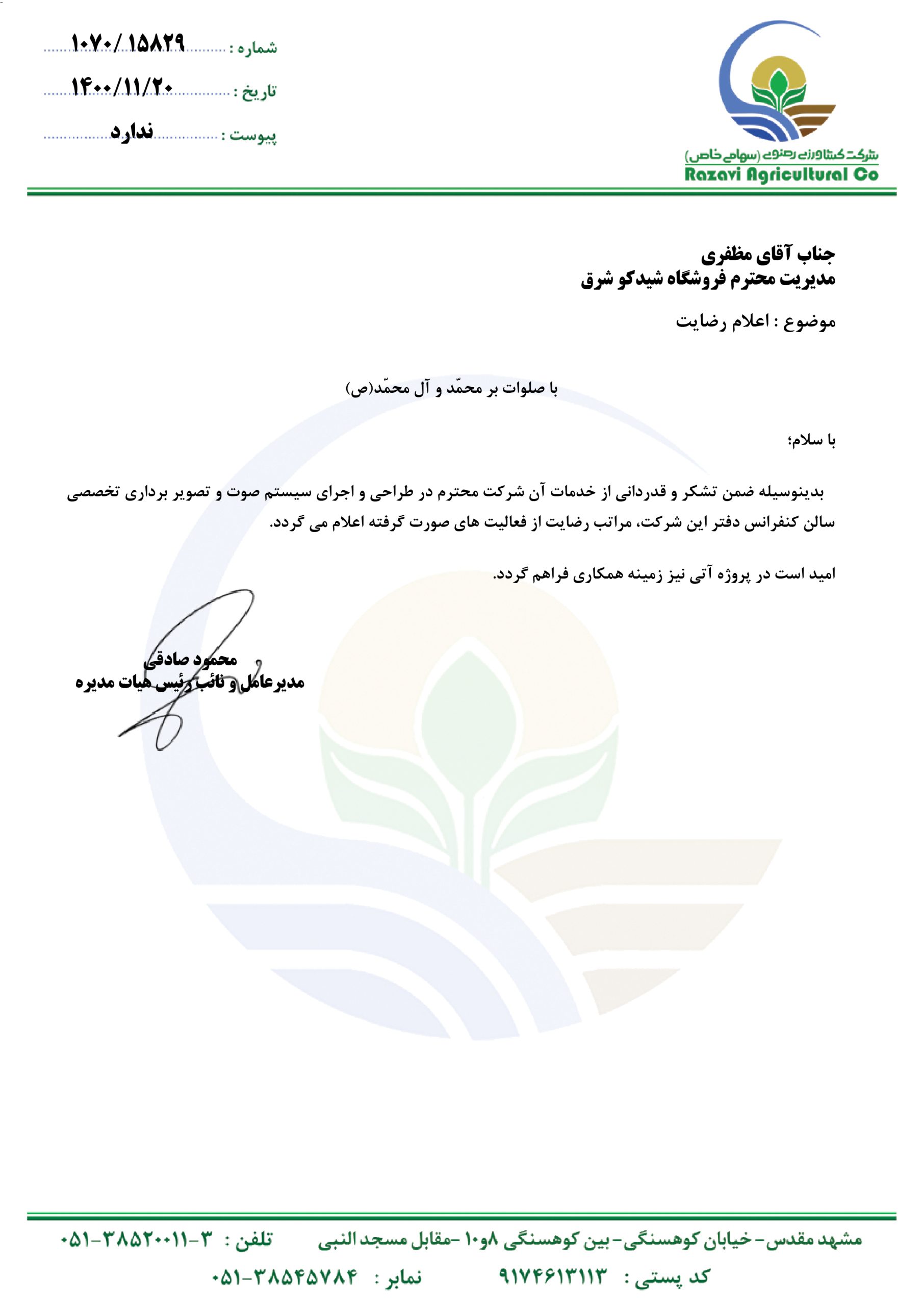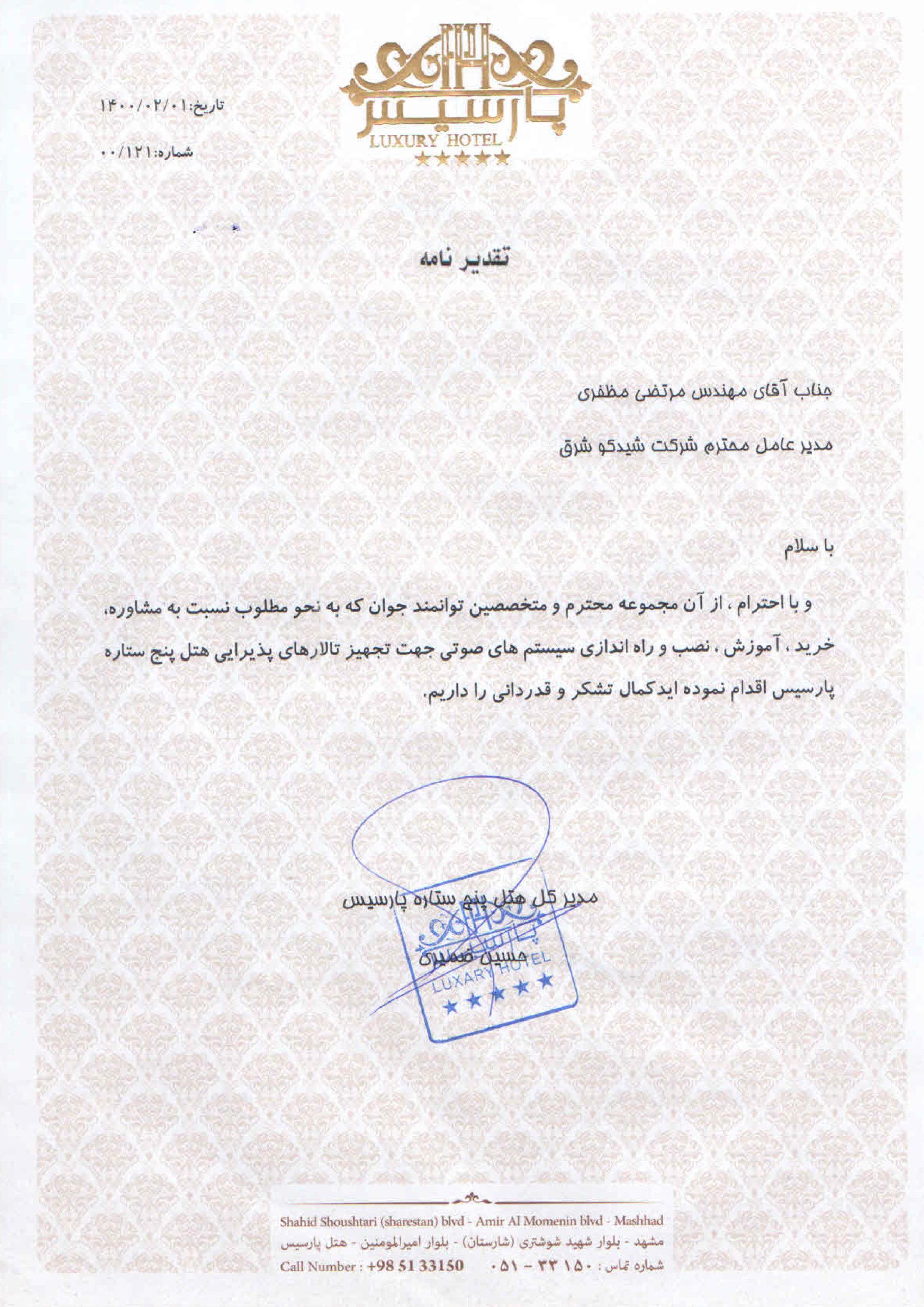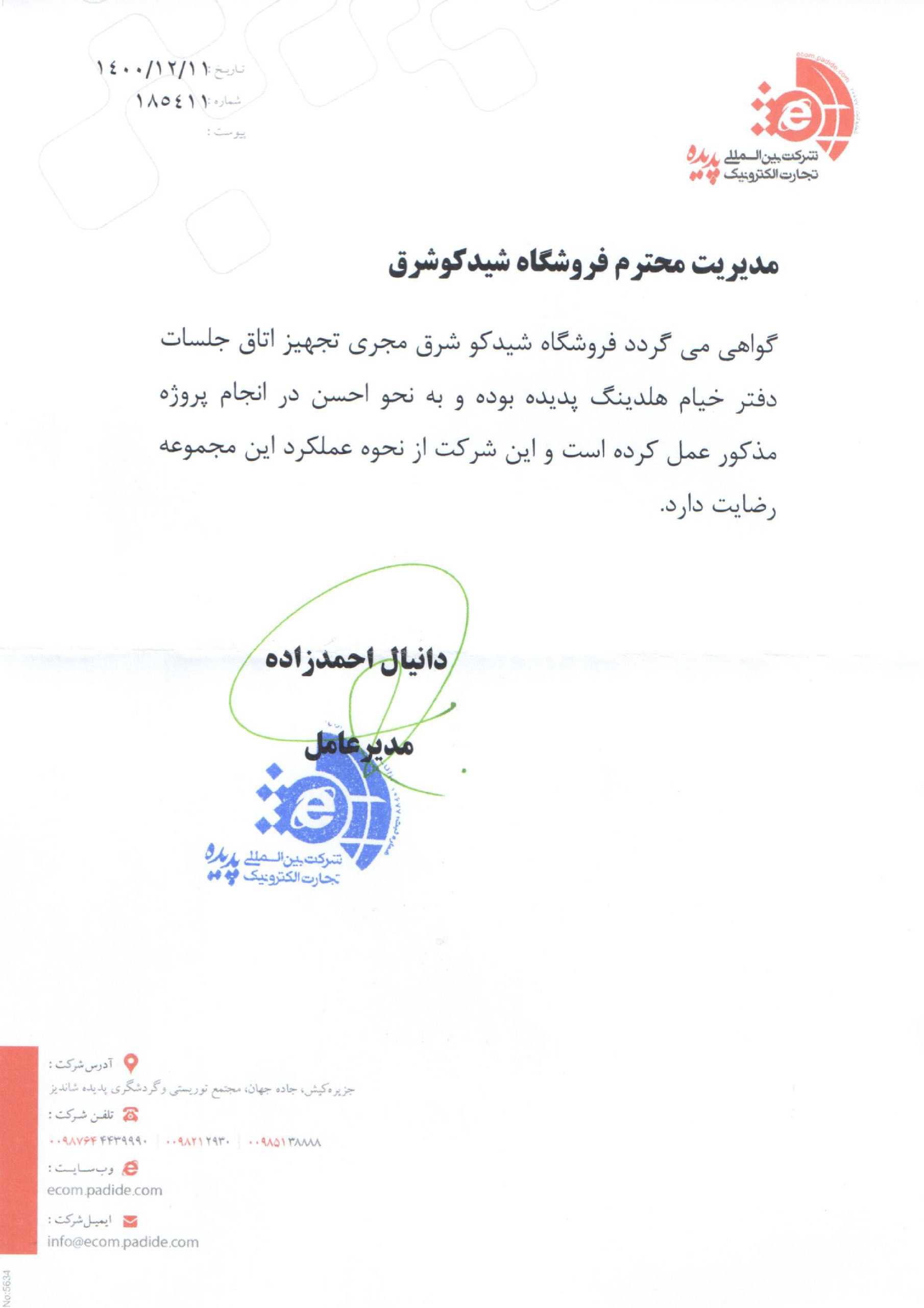 برخی از رضایت نامه ها هر پروژه، قصهای از همکاری و اعتماد است.ما به پشتوانه رضایت مشتریان، روشنتر از همیشه میتابیم.اینها صدای تأیید شماست؛ روشن، شفاف و افتخارآفرین. بهترین ها را از ما بخواهید برند های شیدکو شرق