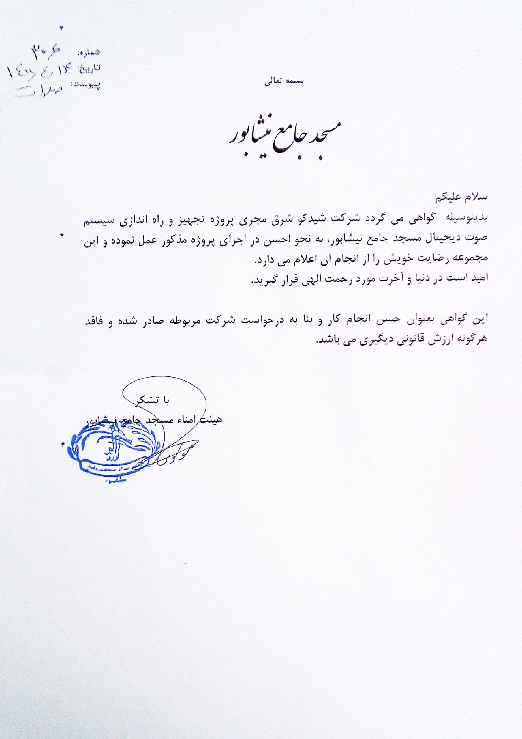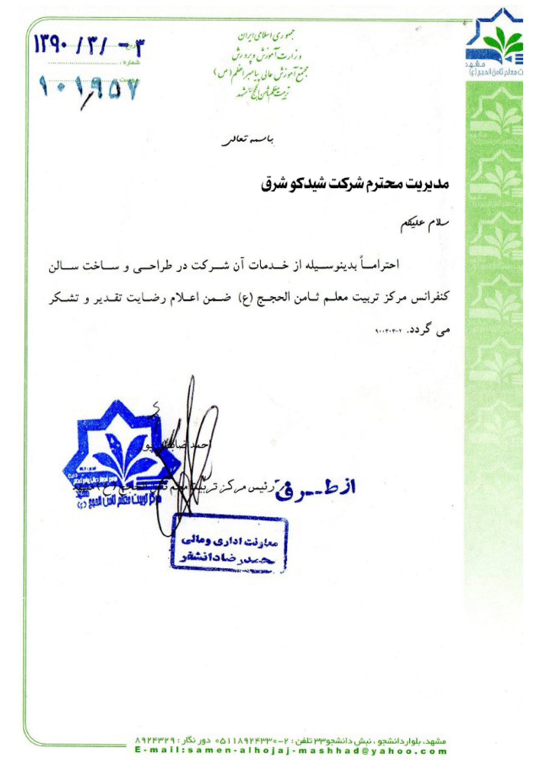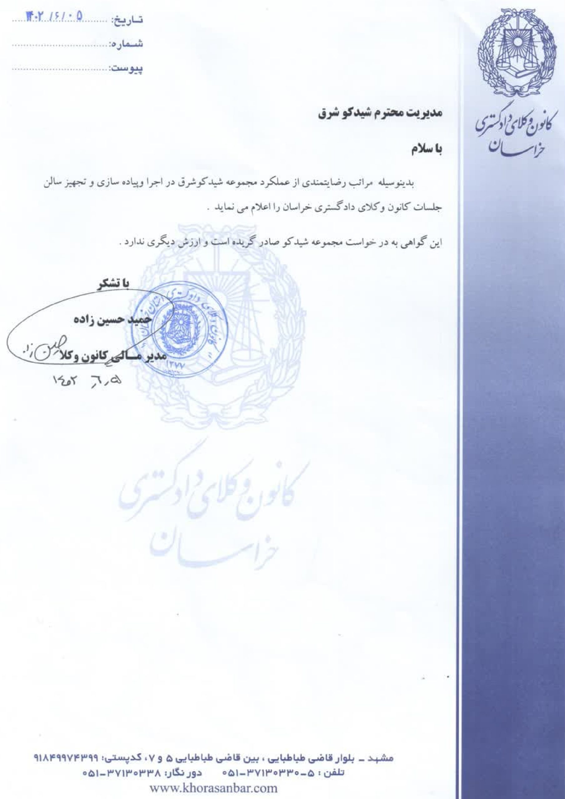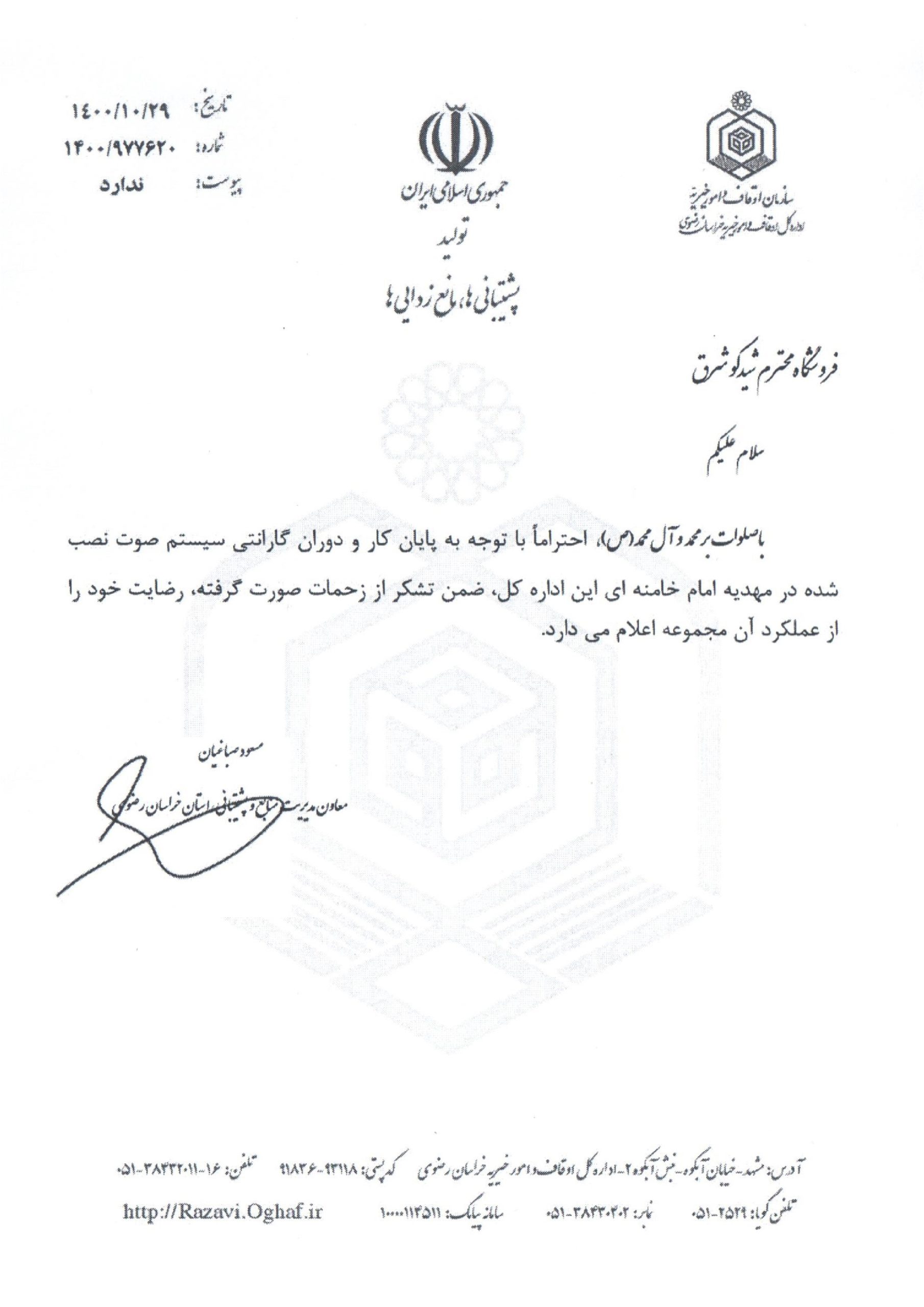 برخی از رضایت نامه ها هر پروژه، قصهای از همکاری و اعتماد است.ما به پشتوانه رضایت مشتریان، روشنتر از همیشه میتابیم.اینها صدای تأیید شماست؛ روشن، شفاف و افتخارآفرین. بهترین ها را از ما بخواهید برند های شیدکو شرق