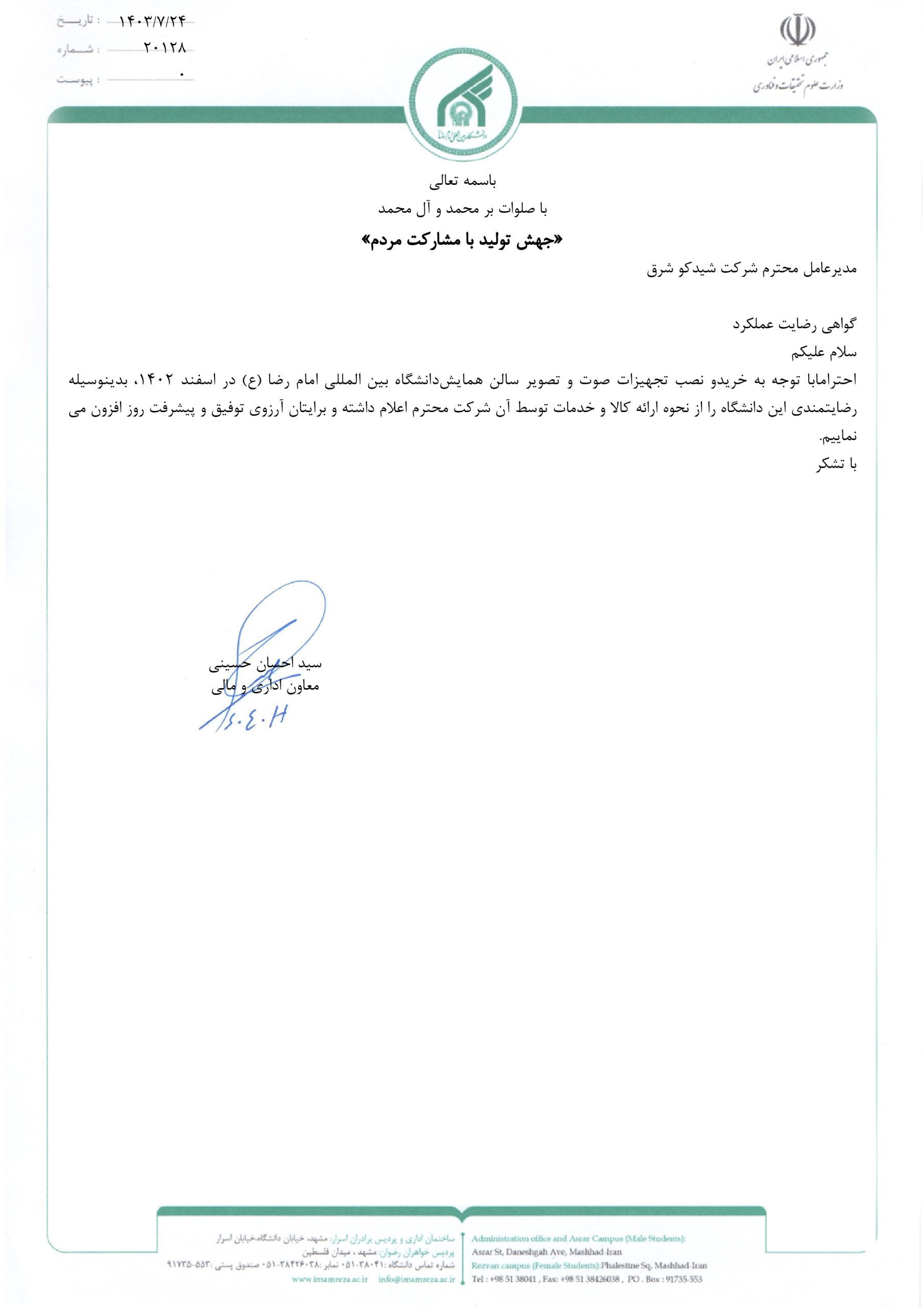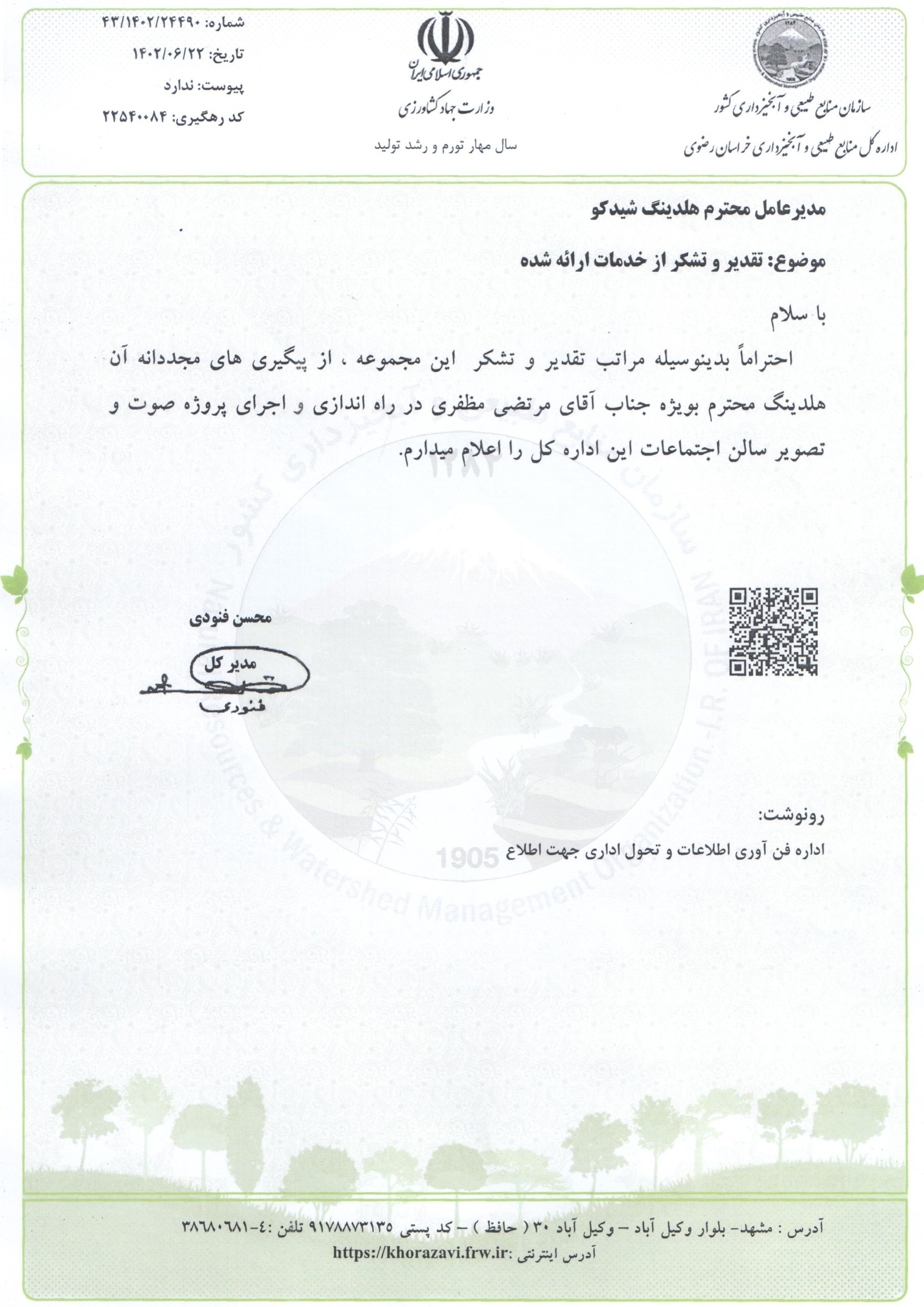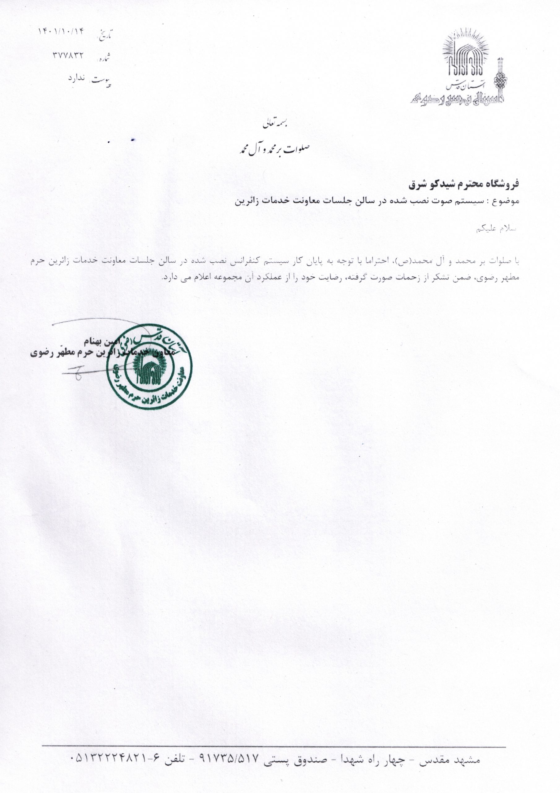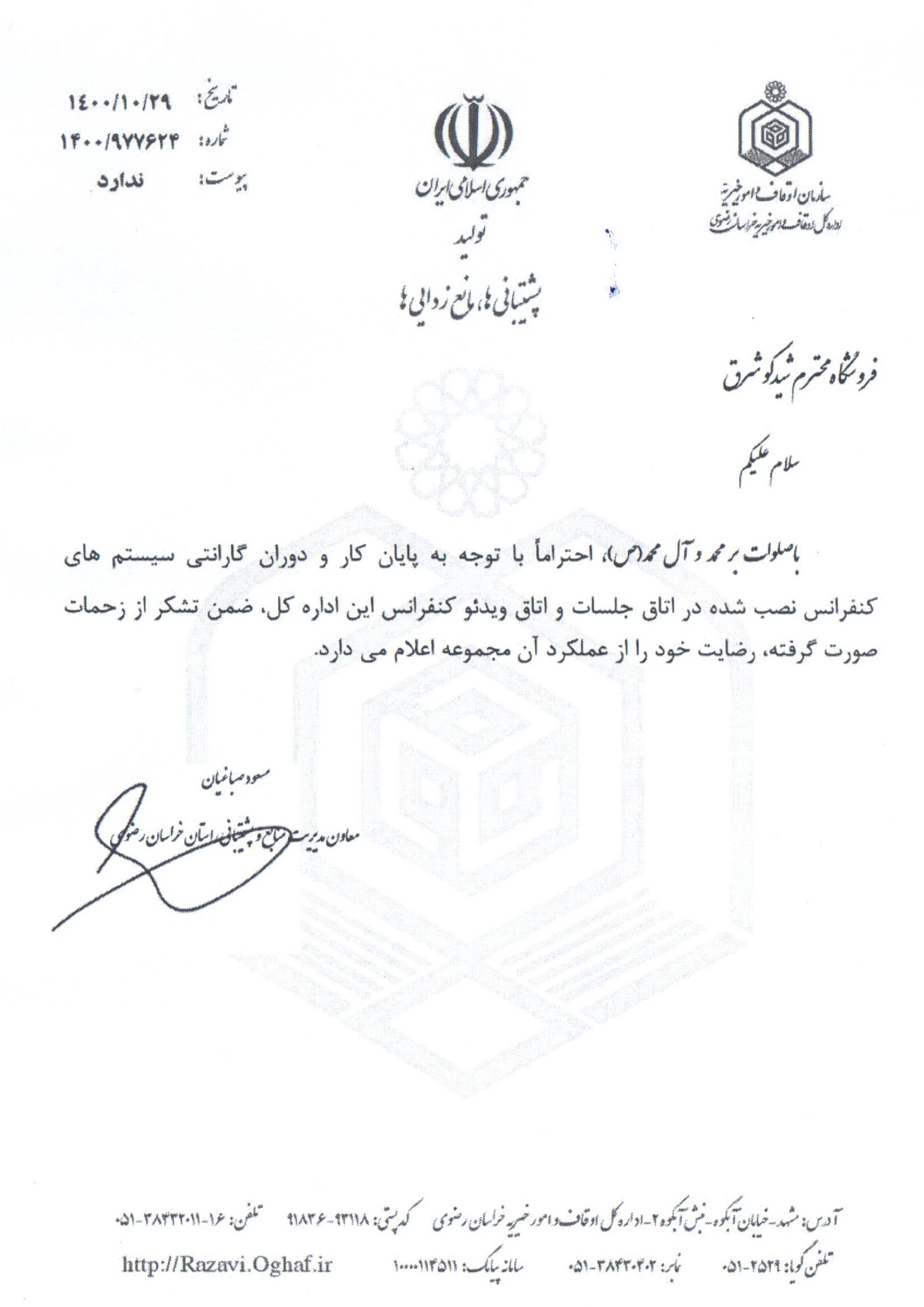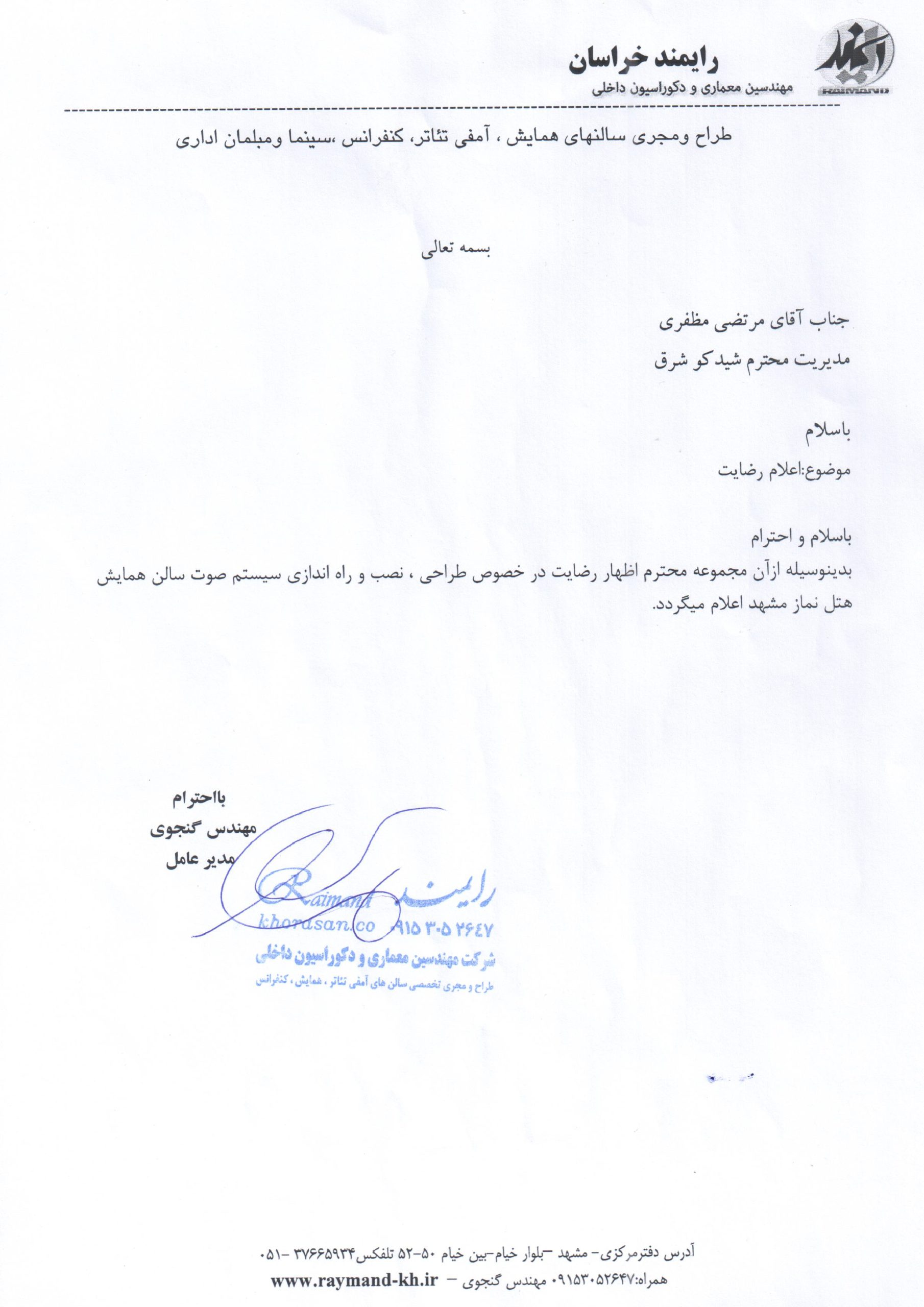 برخی از رضایت نامه ها هر پروژه، قصهای از همکاری و اعتماد است.ما به پشتوانه رضایت مشتریان، روشنتر از همیشه میتابیم.اینها صدای تأیید شماست؛ روشن، شفاف و افتخارآفرین. بهترین ها را از ما بخواهید برند های شیدکو شرق