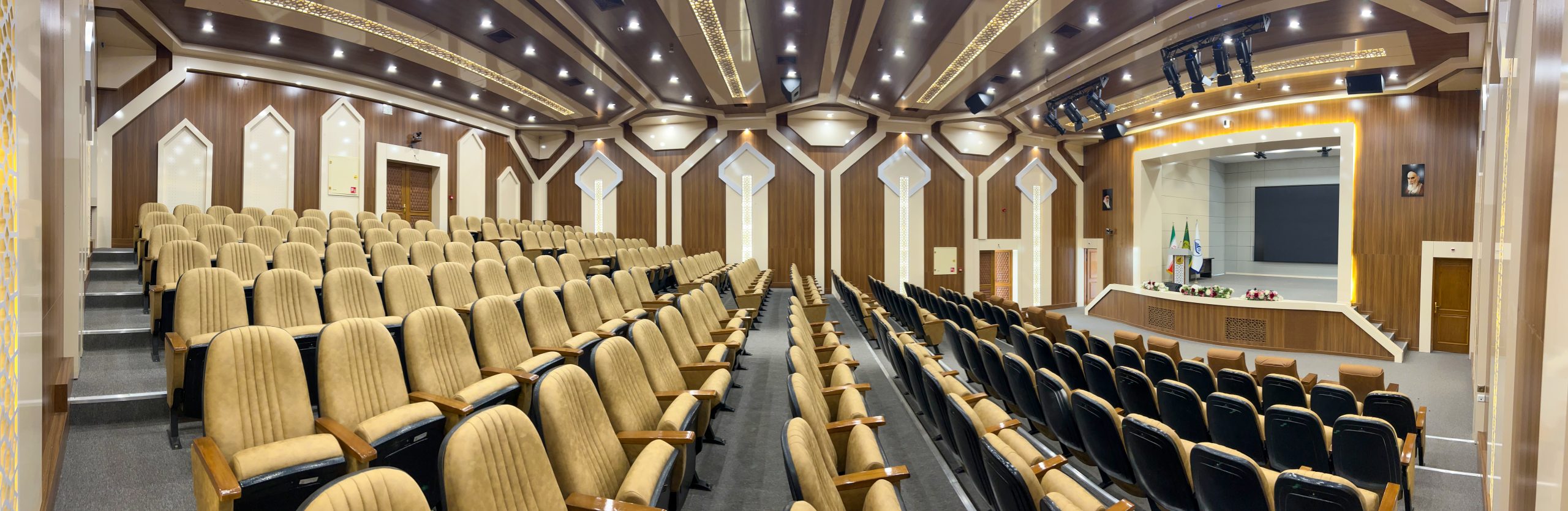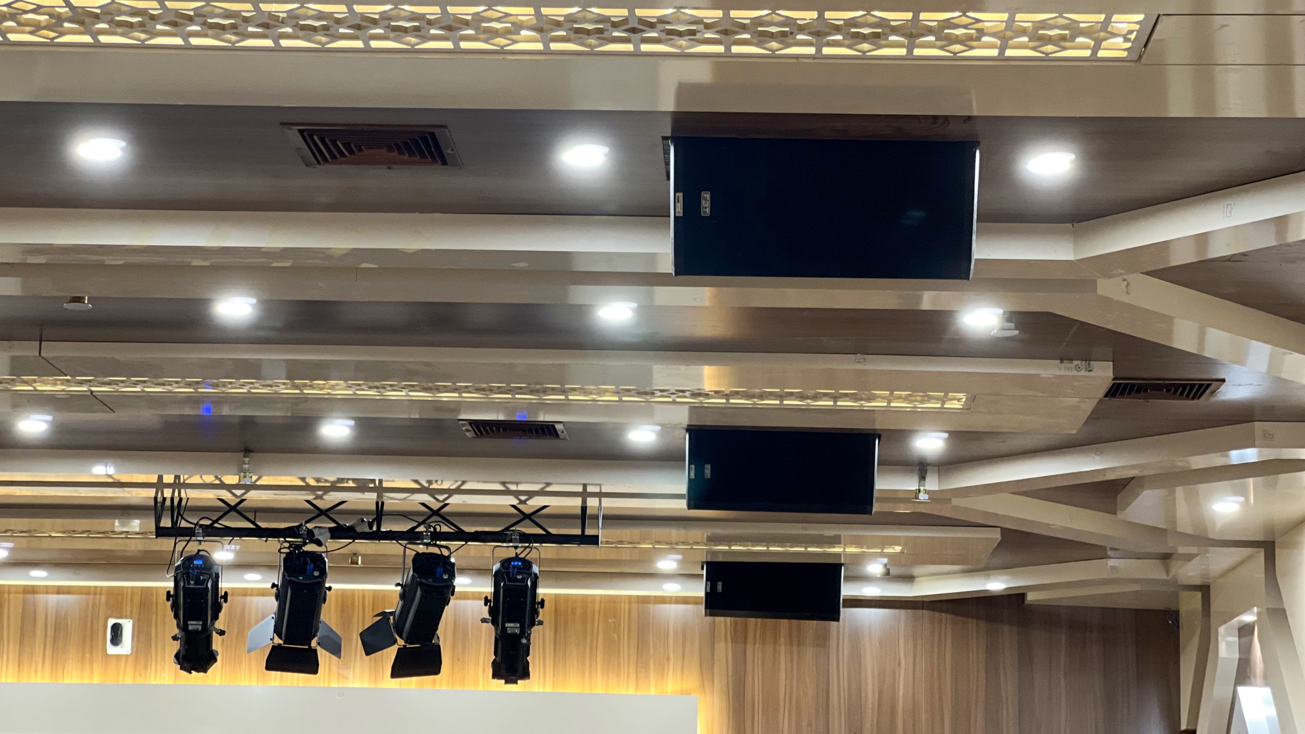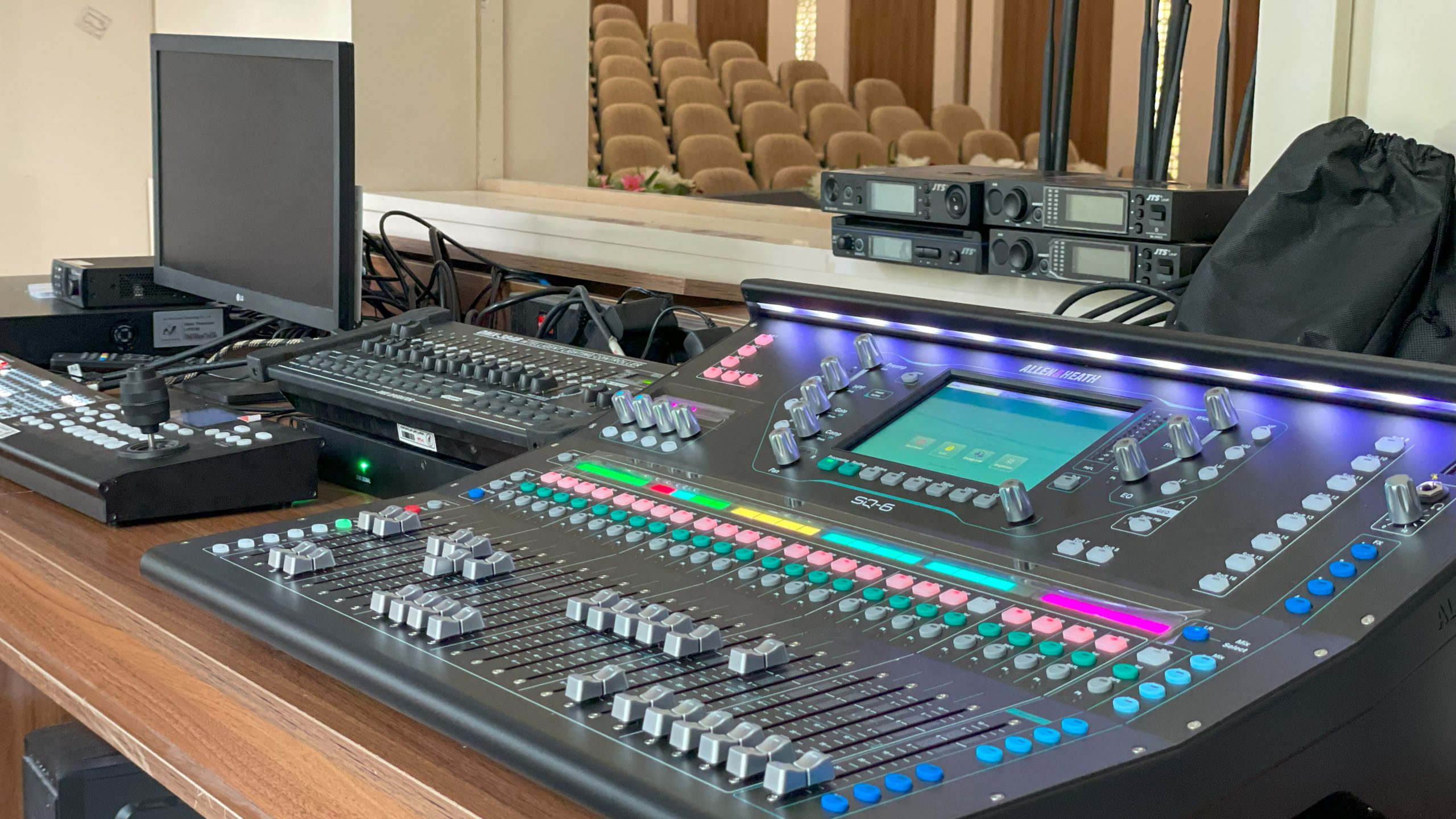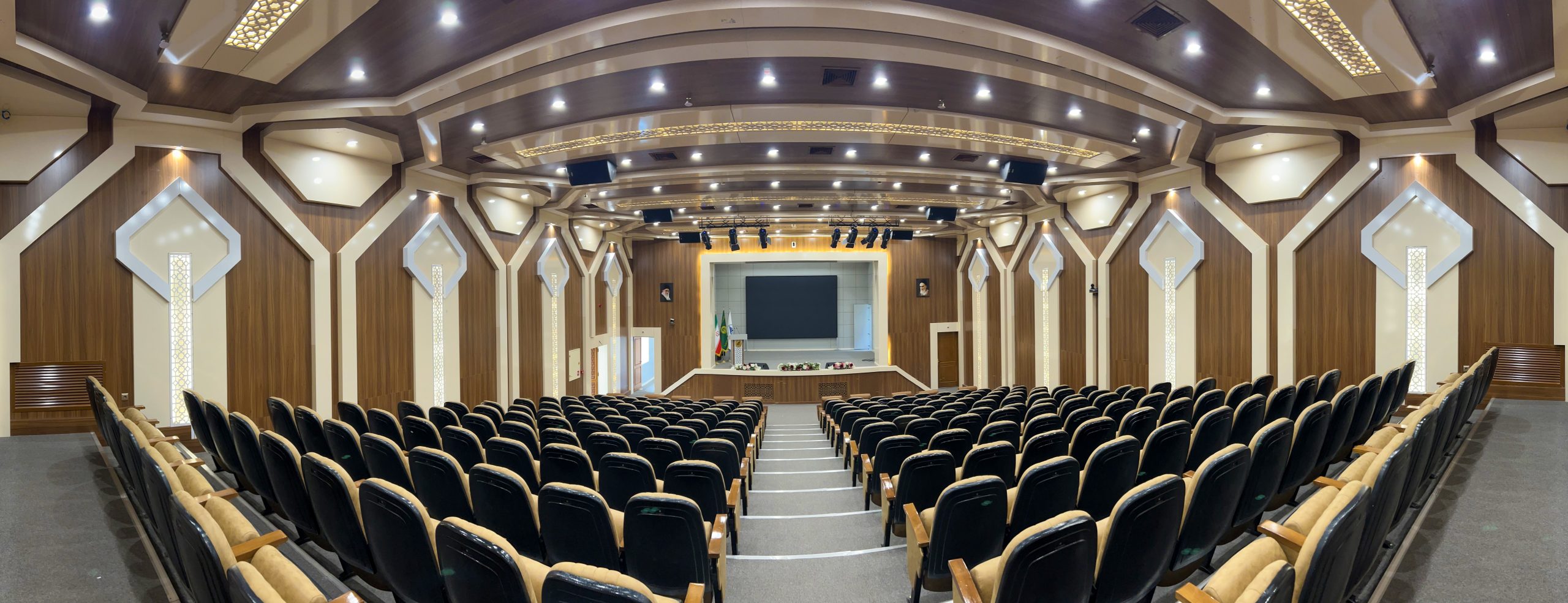 در سیستم صوت محیط از شش عدد اسپیکر اکتیو سری Ventis و دو عدد ساب سری x برند FBT استفاده شده و برای مانیتور صحنه از دو عدد اسپیکر Ventis برند FBT استفاده شده و برای میکسر سالن از سری SQ برند ALLEN & HEATH استفاده شده و از میکروفون های بیسیم برند JTS و میکروفون های سیم دار برند SHURE استفاده شده است.